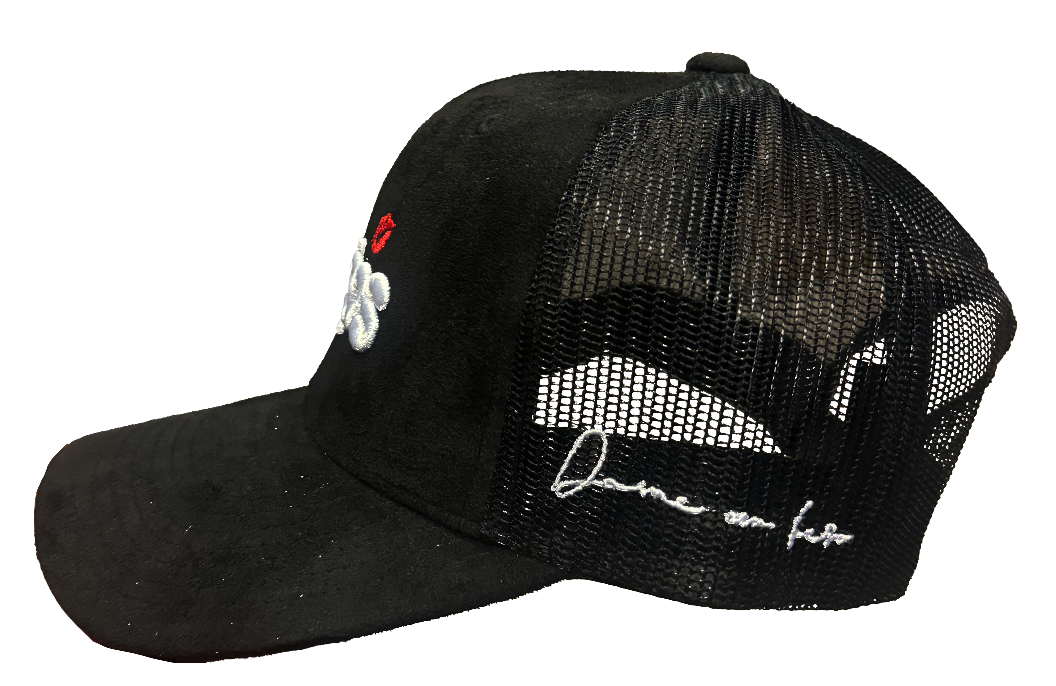 Suede up front, mesh in the back. Embroidered all around. Lightweight and adjustable with a snapback fit.